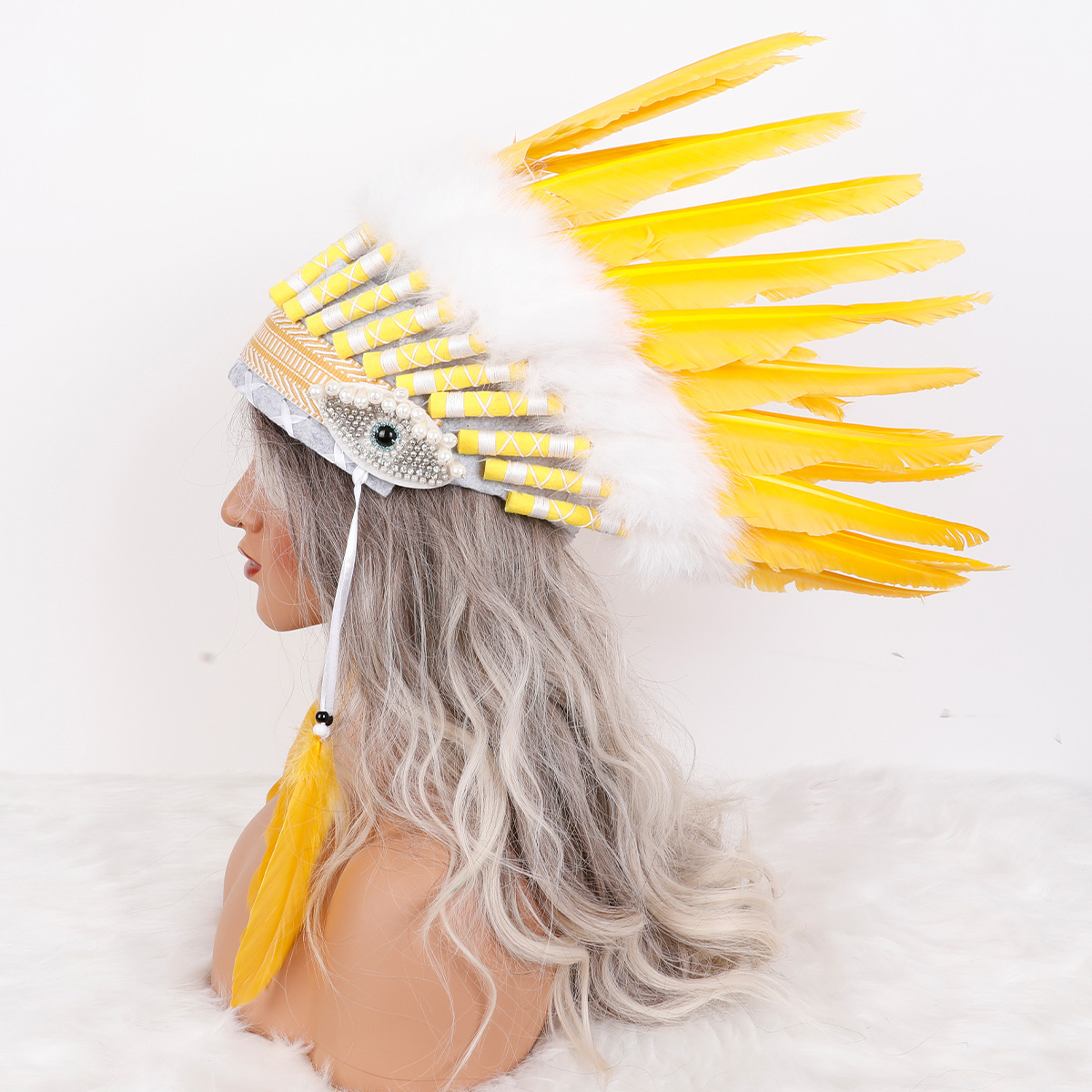 This Indian style headdress is made of natural feathers, and can be matched with feathers of different colors according to different preferences. This headdress is widely used in gatherings of major festivals such as Carnival and Halloween.