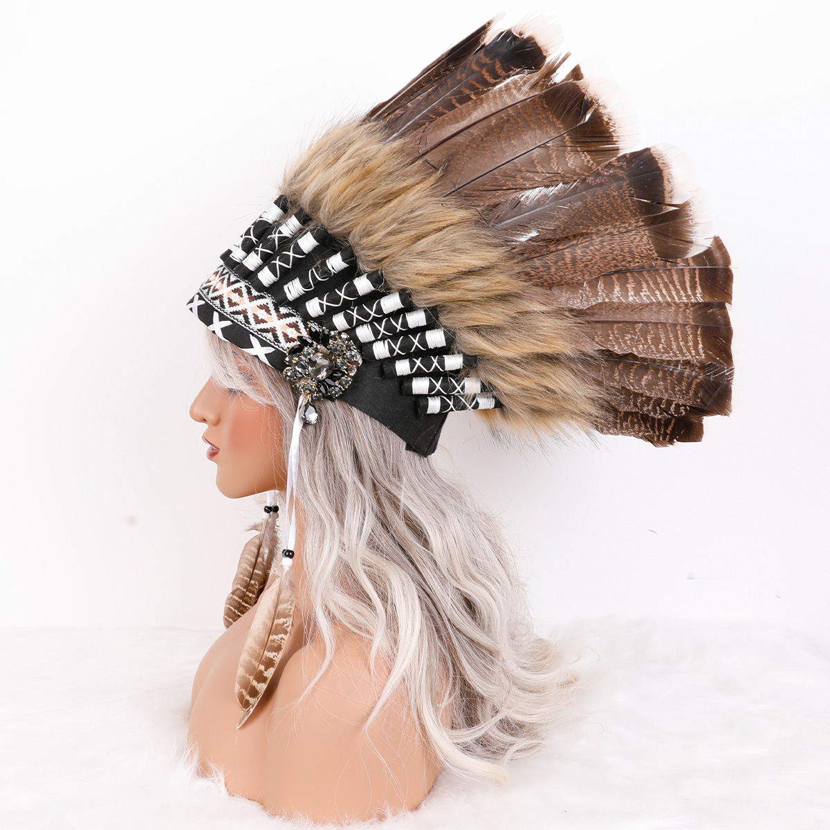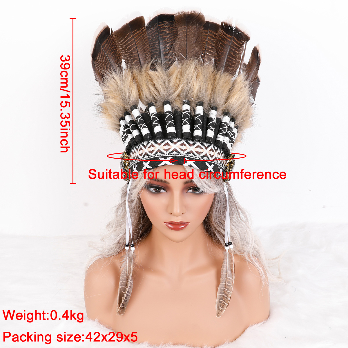 This Indian style headdress is made of natural feathers, and can be matched with feathers of different colors according to different preferences. This headdress is widely used in gatherings of major festivals such as Carnival and Halloween.